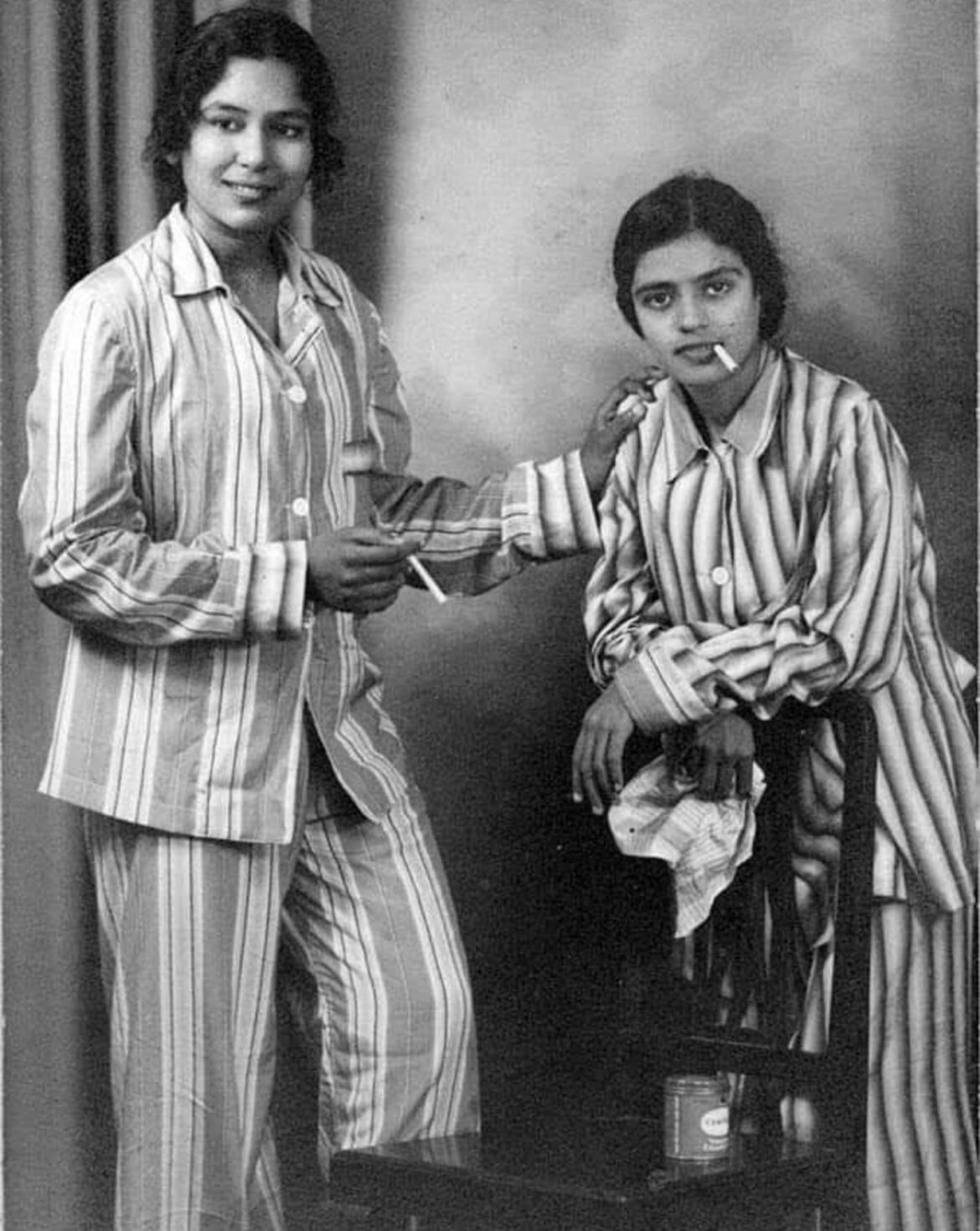 One day in 1937, two young long-haired women in saris stepped into a small photo studio in Madras. They changed into striped pyjama suits and struck a pose 👇 in front of the studio camera. One of them leaned languidly against a chair, while the other’s eyes focused on something outside the frame. Both of them held cigarettes.